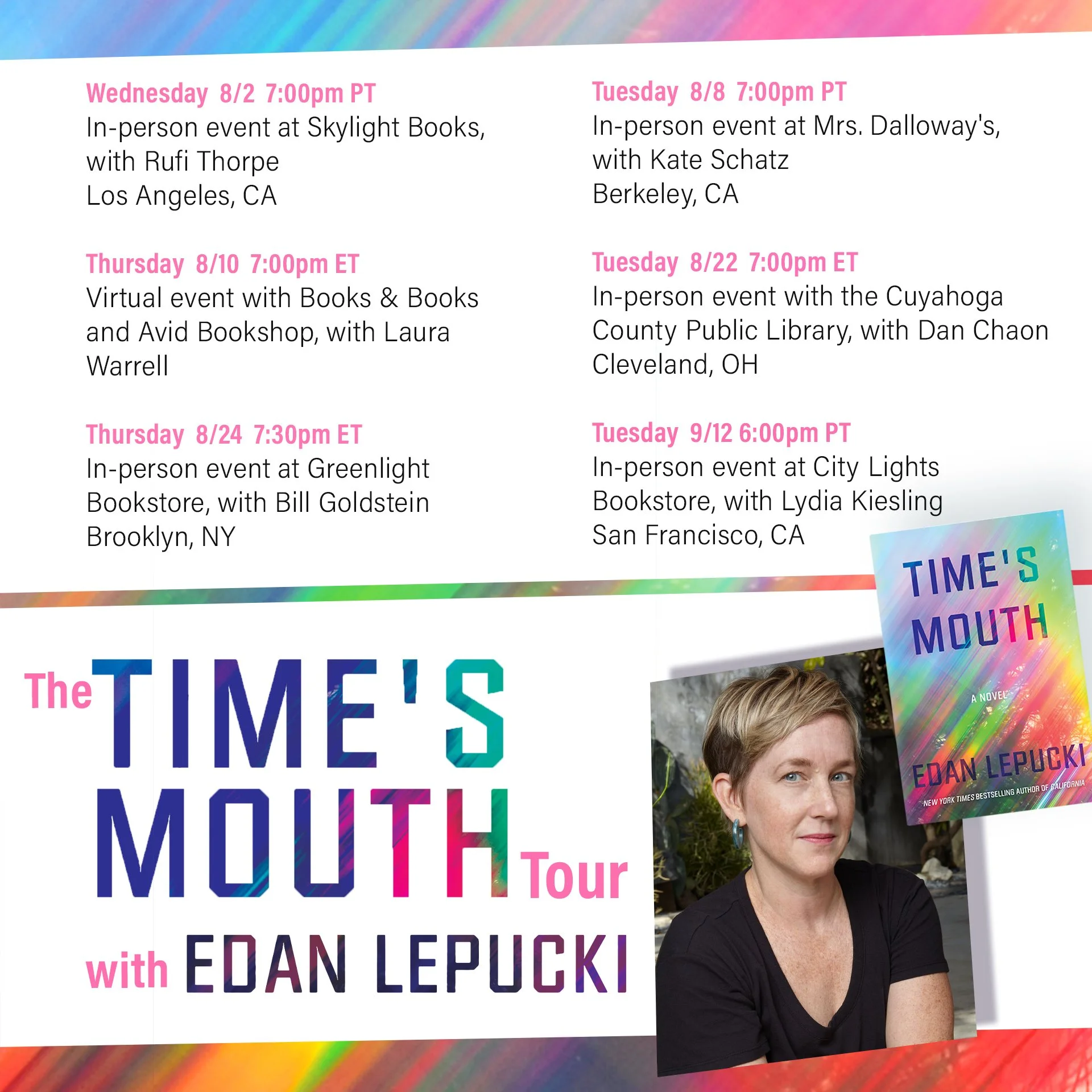 “Novels likeTime’s Mouth are rare: it's both delightful and emotional. Beyond the pleasures of time-travel, all-female cults, and an ominous look at California’s legacy of mysticism, the heart ofTime’s Mouth is a story of mothers and daughters. Edan Lepucki writes with insight and deep pathos about the gifts and curses passed down over generations, and of time’s ability not only to injure but to heal.”